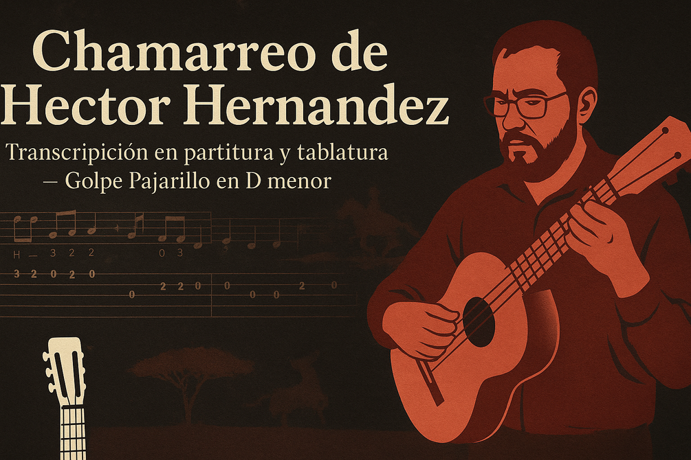 Esta es la transcripción en partitura y tablatura de 1 chamarreo sobre el golpe Pajarillo en D menor característico del bandolista Hector Hernandez.
